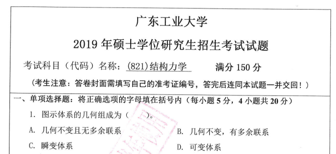 考研学习中,专业课占的分值较大。报考院校专业的考研专业课真题是专业课复习中必不可少的资料。聚创广东工业大学考研赖老师为大家整理了2019年广东工业大学821结构力学考研真题(完整版),并且可以提供广东工业大学考研专业课辅导,希望更多考生能够在专业课上赢得高分,升入理想的院校。