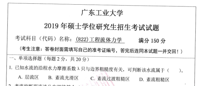 考研学习中,专业课占的分值较大。报考院校专业的考研专业课真题是专业课复习中必不可少的资料。聚创广东工业大学考研赖老师为大家整理了2019年广东工业大学822工程流体力学考研真题(完整版),并且可以提供广东工业大学考研专业课辅导,希望更多考生能够在专业课上赢得高分,升入理想的院校。