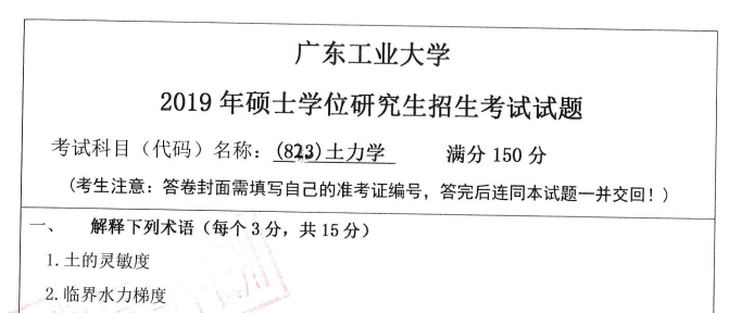 考研学习中,专业课占的分值较大。报考院校专业的考研专业课真题是专业课复习中必不可少的资料。聚创广东工业大学考研赖老师为大家整理了2019年广东工业大学823土力学考研真题(完整版),并且可以提供广东工业大学考研专业课辅导,希望更多考生能够在专业课上赢得高分,升入理想的院校。