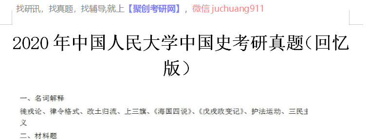 以上是聚创考研网为考生整理的"2020年中国人民大学中国史考研真题(回忆版)"的相关考研信息,希望对大家考研备考有所帮助! 备考过程中如有疑问,也可以添加老师微信juchuang911进行咨询。