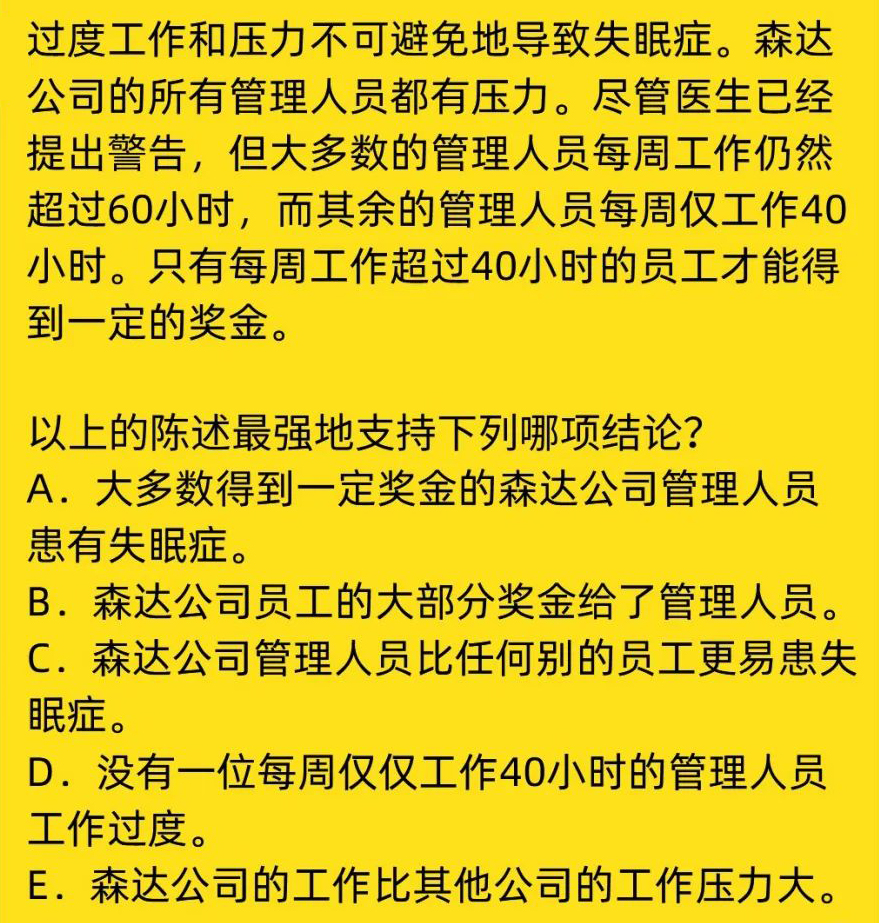 以上是聚创考研网为考生整理的"2021年管理类考研:逻辑部分-过度工作、压力、奖金的关系Part.131"的相关考研信息,希望对大家考研备考有所帮助! 备考过程中如有疑问,也可以添加老师微信juchuang911进行咨询。