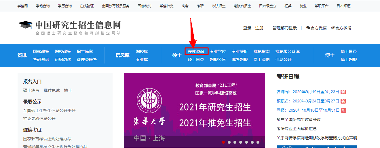 咨询入口:中国研究生招生信息网站(http://yz.chsi.com.cn/),进入研招网主页面后点击硕士栏目的【在线咨询】(注:20考研因为疫情原因多数院校线上复试,于是在20年4月份,首次在复试阶段开通在线咨询,目前咨询显示入口依然是在这个栏目),即可进入考研咨询页面。