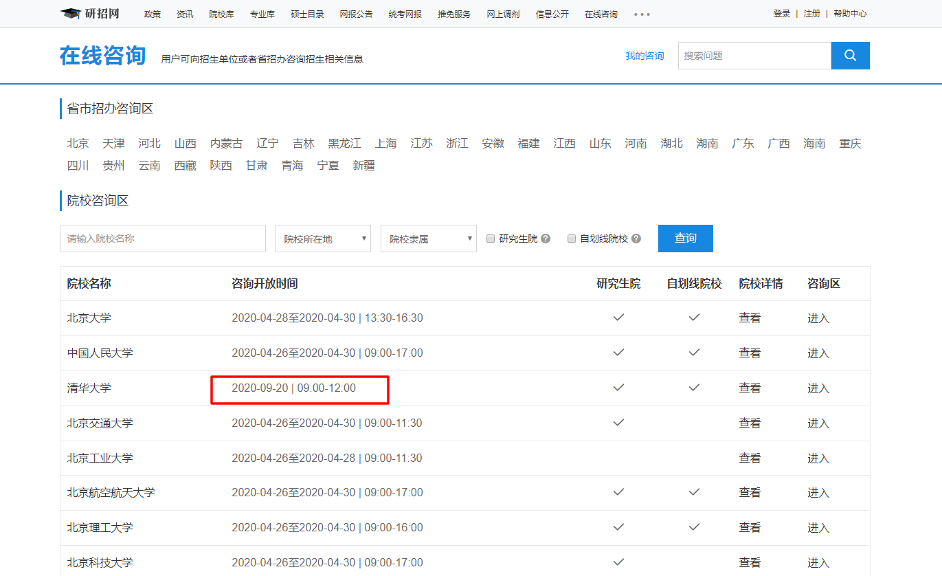 从下图可以看得出来,目前只有清华大学公布了咨询时间,而且!同学们仔细看,清华大学的资讯时间只有三小时!所以,在有效的咨询时间内,千万不要浪费时间!后续大家要陆续关注其他院校的咨询时间!