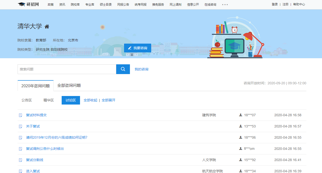 如下图所示,咨询版块主要分为两个,一个是省办咨询区,一个是院校咨询区。