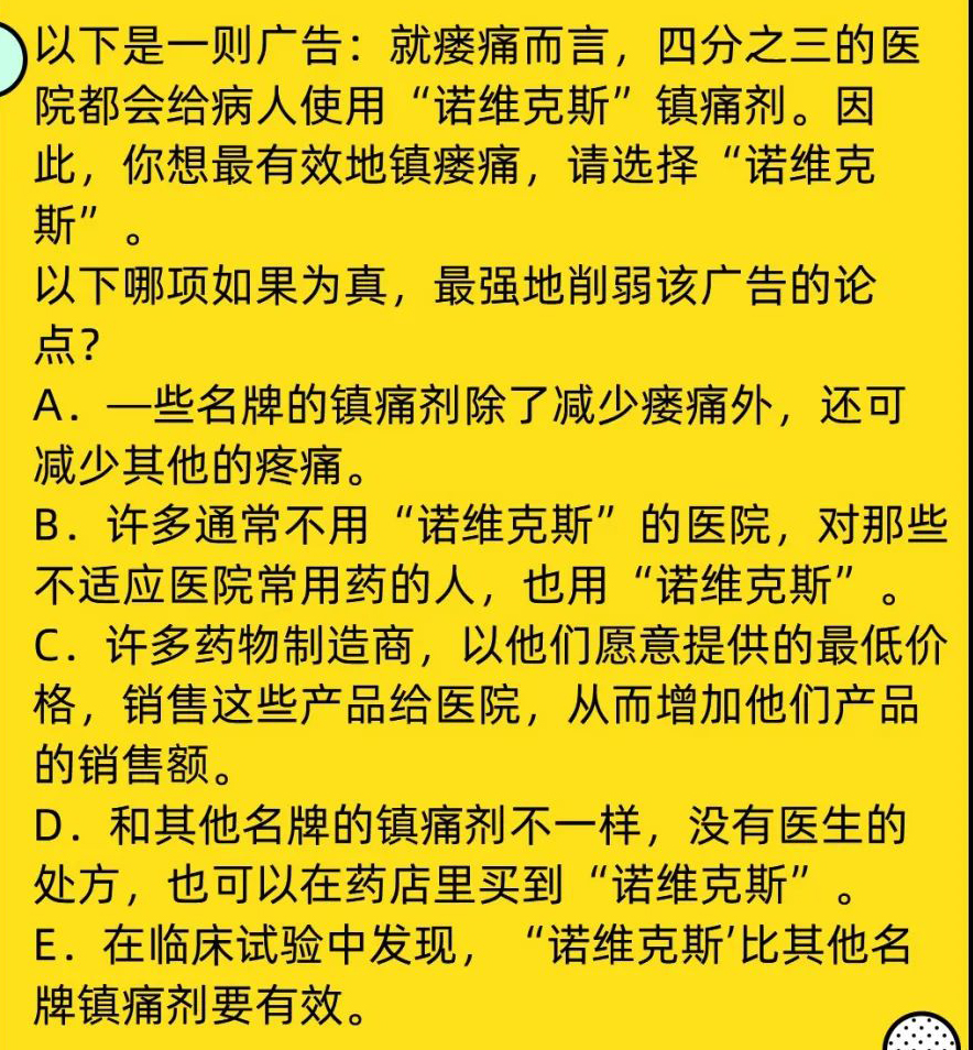 以上是聚创考研网为考生整理的"2021年管理类考研:逻辑部分-削弱诺维克斯广告的论点Part.135"的相关考研信息,希望对大家考研备考有所帮助! 备考过程中如有疑问,也可以添加老师微信juchuang911进行咨询。