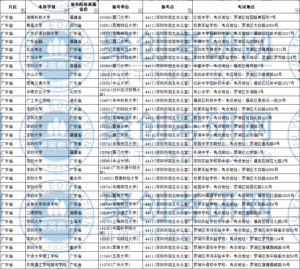 同学们可参考去年或者往年的考场安排,一般不会有改变,以下是聚创考研网 整理的去年报名【4411深圳市招生办公室】报考点的考场信息,同学们可根据【第2列本科院校、第4列报考学校】等作为参考。