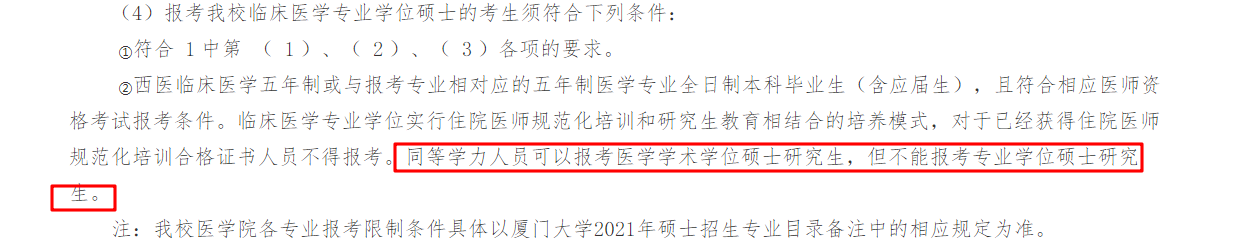 首先聚创考研网学姐介绍的,当然就是厦门大学了,前几天厦门大学的招生目录以及招生简章已经公布,学姐就去看了一下,同等学力的考生可以报考医学学术学位硕士研究生,不能报考专业学位硕士研究生。