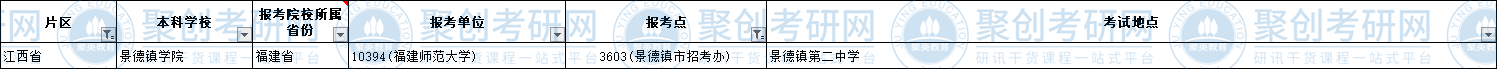同学们可参考去年或者往年的考场安排,一般不会有改变,以下是聚创考研网 整理的去年报名【3603景德镇市招考办】报考点的考场信息,同学们可根据本科院校、报考学校等作为参考。