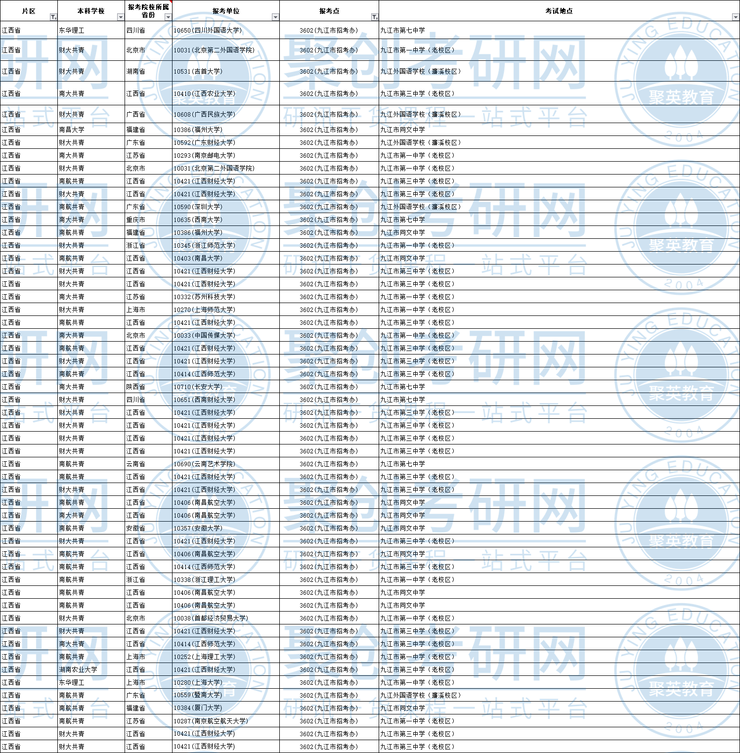 同学们可参考去年或者往年的考场安排,一般不会有改变,以下是聚创考研网 整理的去年报名【3602九江市招考办】报考点的考场信息,同学们可根据本科院校、报考学校等作为参考。