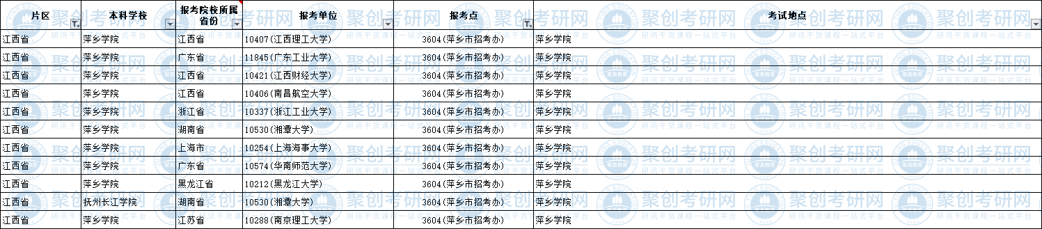 同学们可参考去年或者往年的考场安排,一般不会有改变,以下是聚创考研网 整理的去年报名【3604萍乡市招考办】报考点的考场信息,同学们可根据本科院校、报考学校等作为参考。