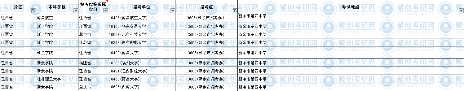 同学们可参考去年或者往年的考场安排,一般不会有改变,以下是聚创考研网 整理的去年报名【3606新余市招考办】报考点的考场信息,同学们可根据本科院校、报考学校等作为参考。