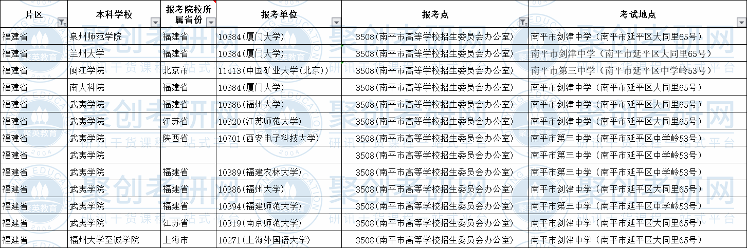 同学们可参考去年或者往年的考场安排,一般不会有改变,以下是聚创考研网 整理的去年报名【3508南平市高等学校招生委员会办公室】报考点的考场信息,同学们可根据【第2列本科院校、第4列报考学校】等作为参考。