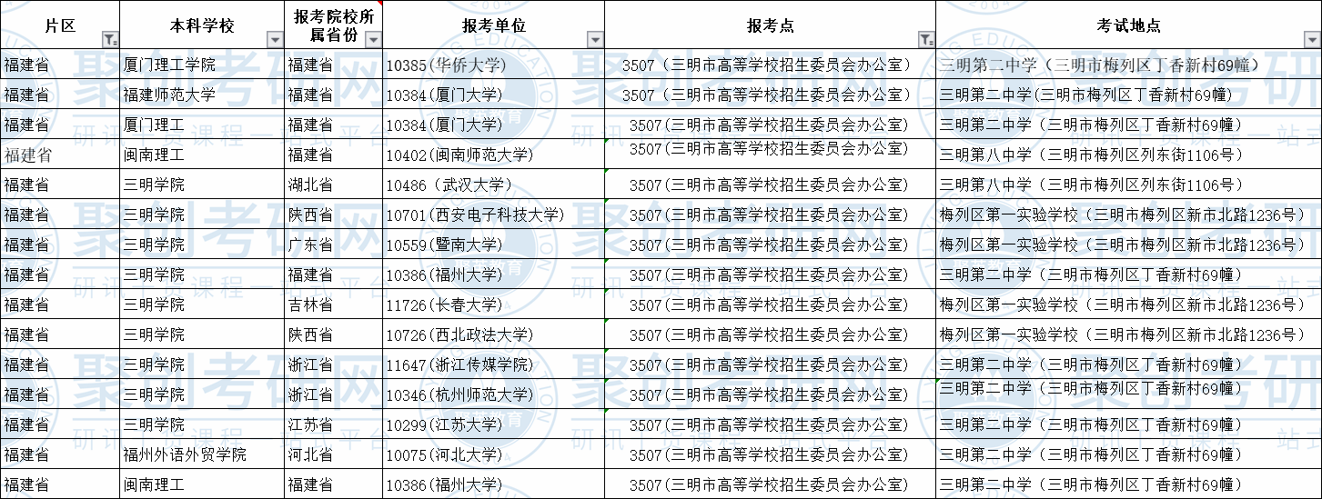 同学们可参考去年或者往年的考场安排,一般不会有改变,以下是聚创考研网 整理的去年报名【3507三明市高等学校招生委员会办公室】报考点的考场信息,同学们可根据【第2列本科院校、第4列报考学校】等作为参考。