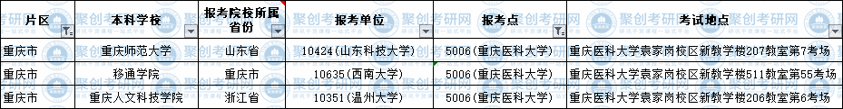 同学们可参考去年或者往年的考场安排,一般不会有改变,以下是聚创考研网整理的去年报名【5006重庆医科大学】报考点的考场信息,同学们可根据【第2列本科院校、第4列报考学校】等作为参考。