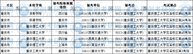 同学们可参考去年或者往年的考场安排,一般不会有改变,以下是聚创考研网整理的去年报名【5013重庆理工大学】报考点的考场信息,同学们可根据【第2列本科院校、第4列报考学校】等作为参考。
