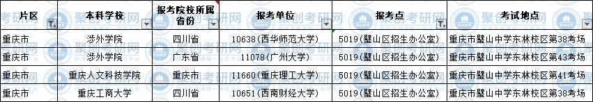 同学们可参考去年或者往年的考场安排,一般不会有改变,以下是聚创考研网整理的去年报名【5019璧山区招生办公室】报考点的考场信息,同学们可根据【第2列本科院校、第4列报考学校】等作为参考。