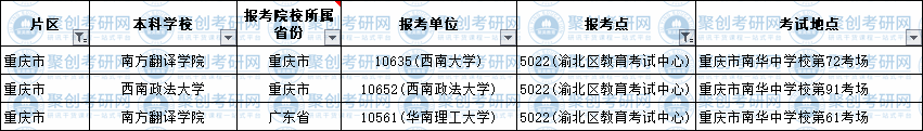 同学们可参考去年或者往年的考场安排,一般不会有改变,以下是聚创考研网整理的去年报名【5022渝北区教育考试中心】报考点的考场信息,同学们可根据【第2列本科院校、第4列报考学校】等作为参考。