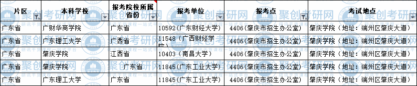 同学们可参考去年或者往年的考场安排,一般不会有改变,以下是聚创考研网整理的去年报名【4406肇庆市招生办公室】报考点的考场信息,同学们可根据【第2列本科院校、第4列报考学校】等作为参考。