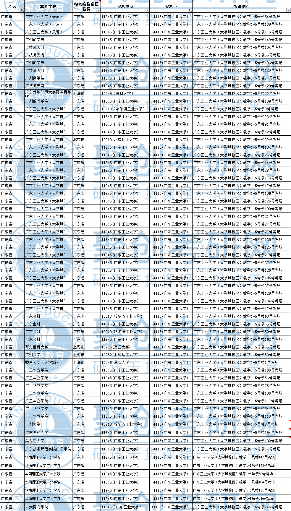 同学们可参考去年或者往年的考场安排,一般不会有改变,以下是聚创考研网整理的去年报名【4416广东工业大学】报考点的考场信息,同学们可根据【第2列本科院校、第4列报考学校】等作为参考。