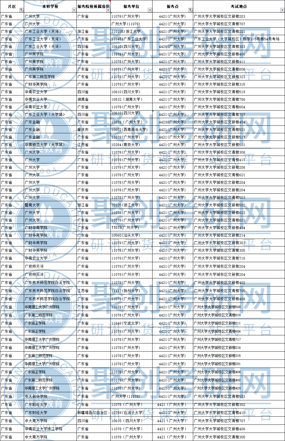 同学们可参考去年或者往年的考场安排,一般不会有改变,以下是聚创考研网整理的去年报名【4421广州大学】报考点的考场信息,同学们可根据【第2列本科院校、第4列报考学校】等作为参考。