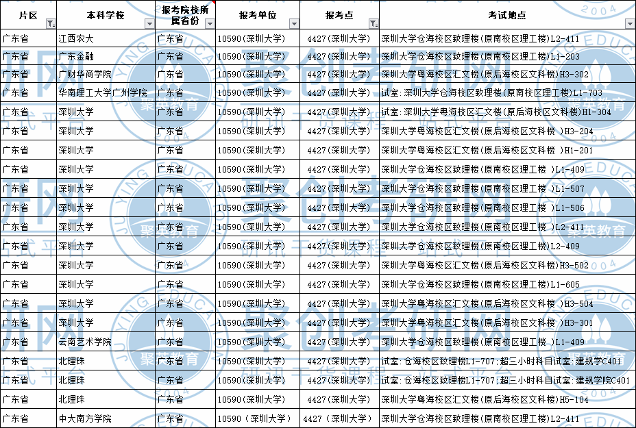 同学们可参考去年或者往年的考场安排,一般不会有改变,以下是聚创考研网整理的去年报名【4427深圳大学】报考点的考场信息,同学们可根据【第2列本科院校、第4列报考学校】等作为参考。