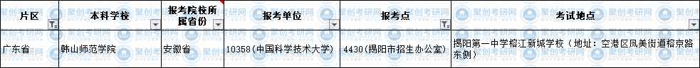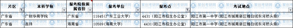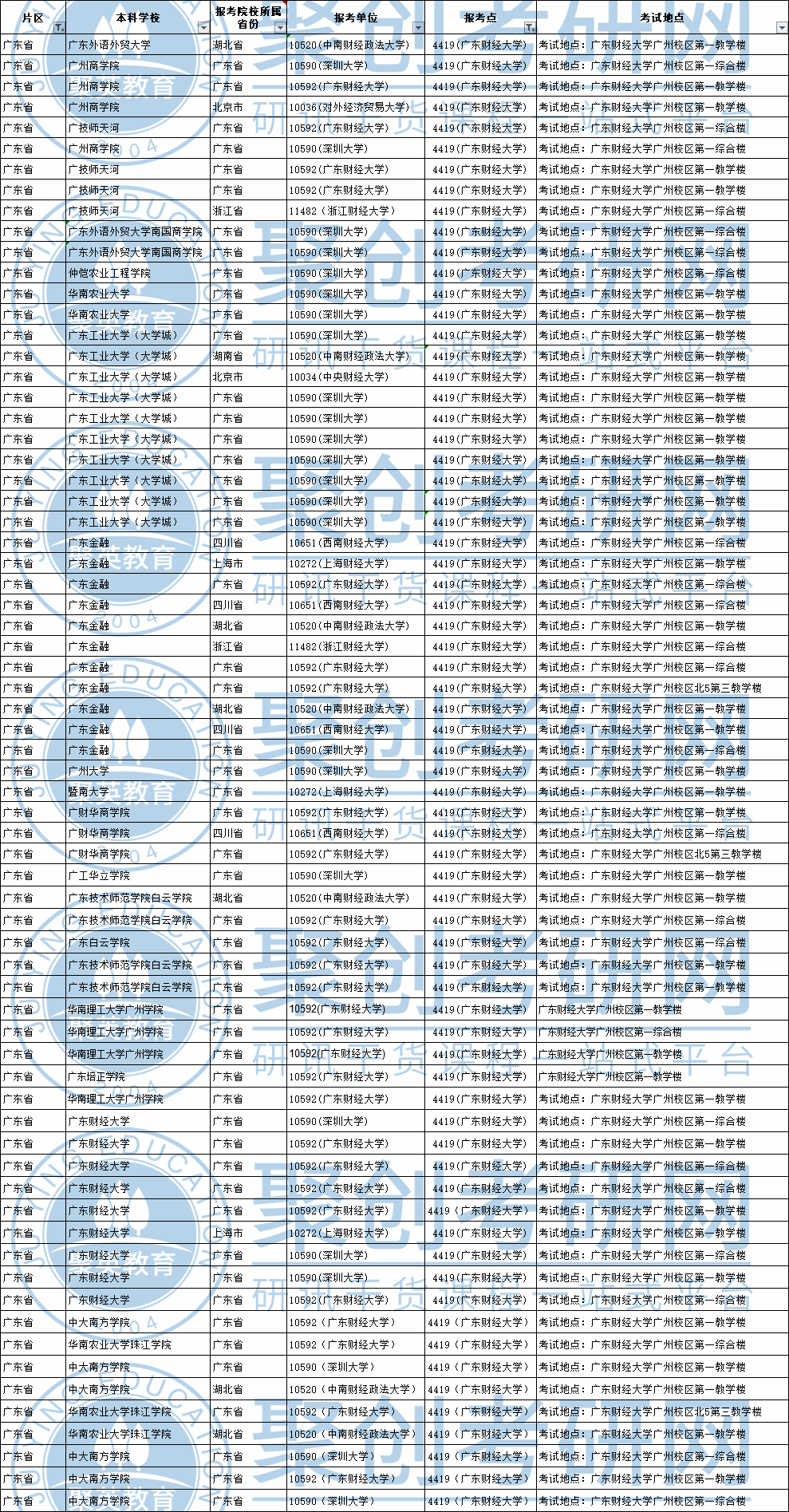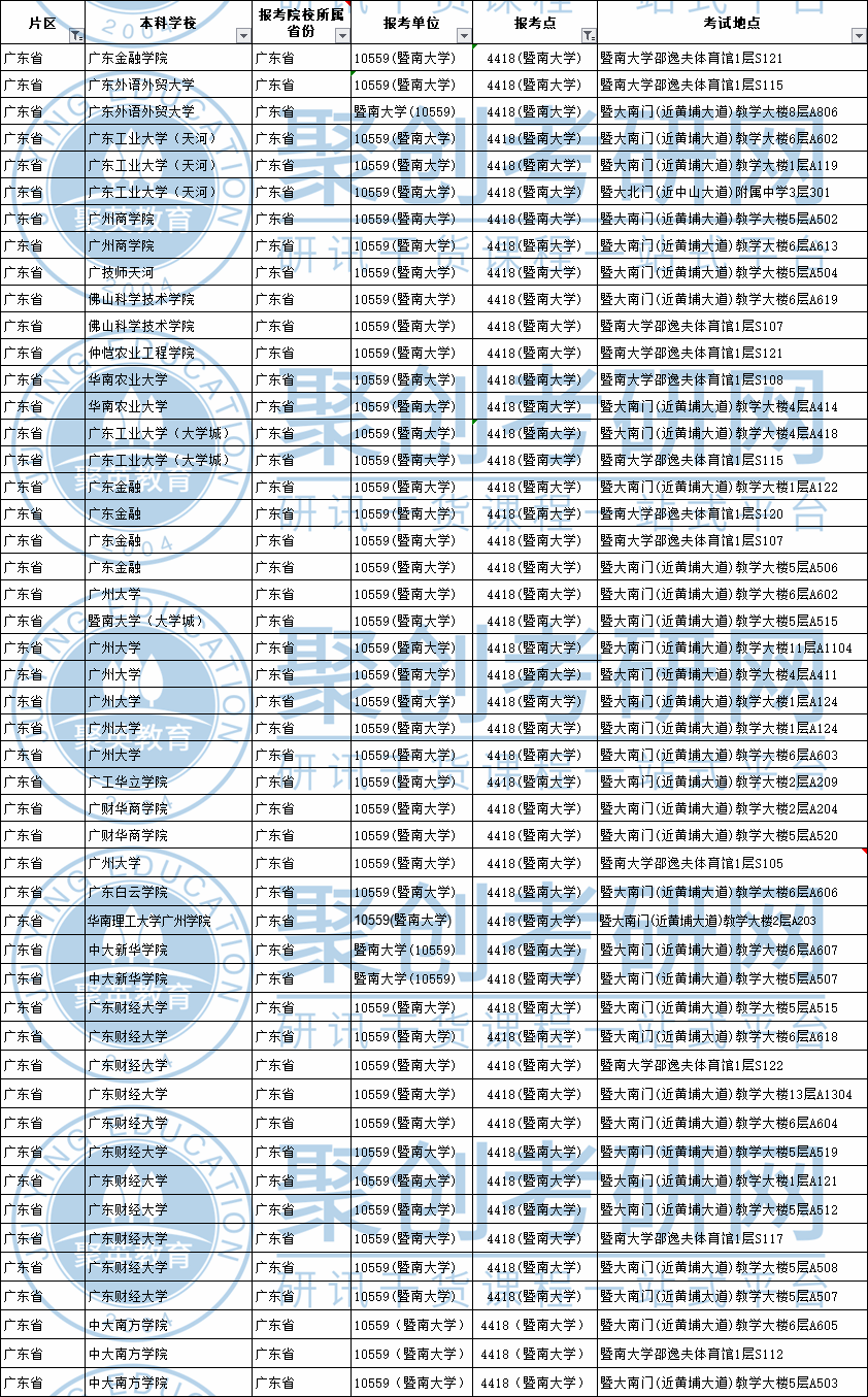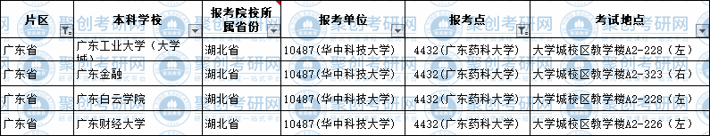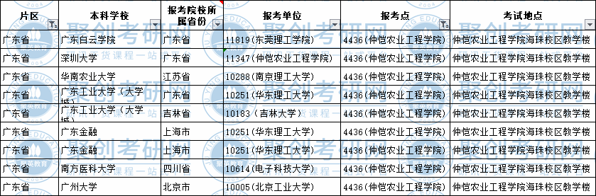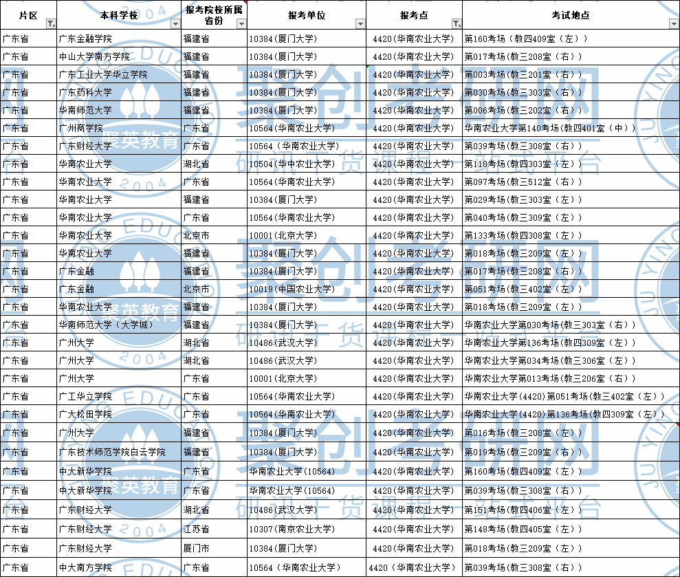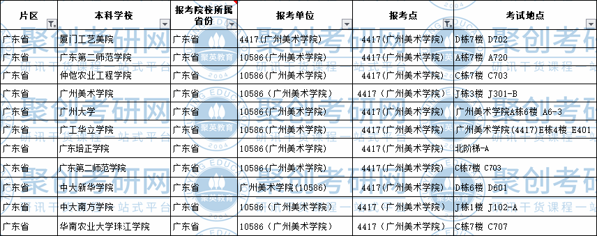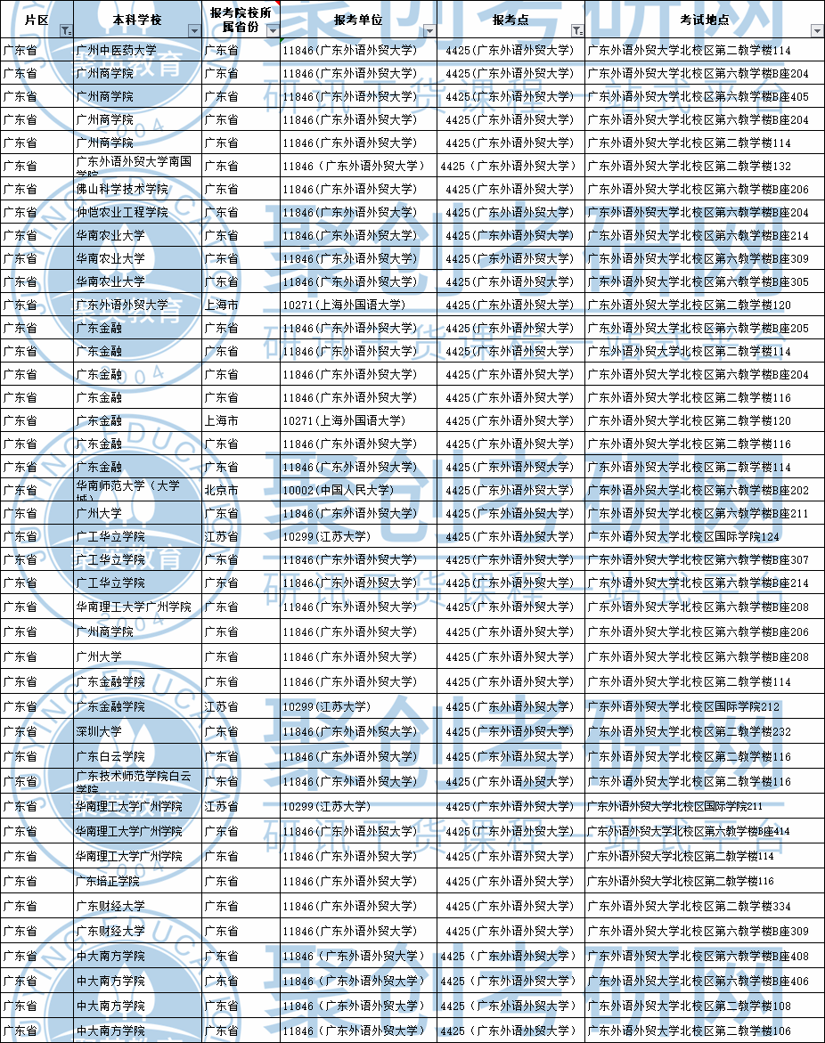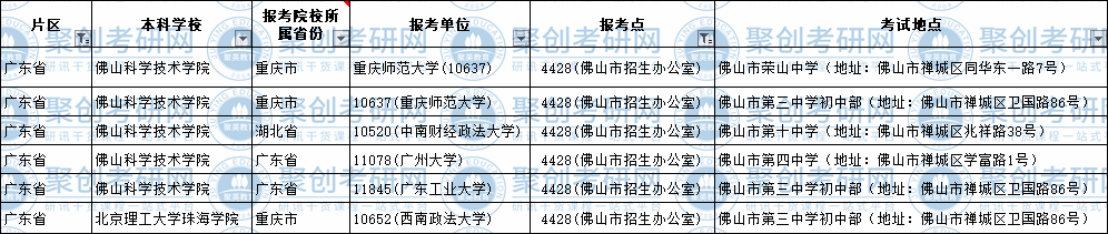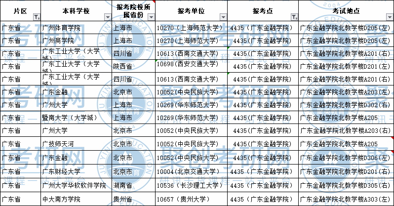 同学们可参考去年或者往年的考场安排,一般不会有改变,以下是聚创考研网整理的去年报名【4435广东金融学院】报考点的考场信息,同学们可根据【第2列本科院校、第4列报考学校】等作为参考。