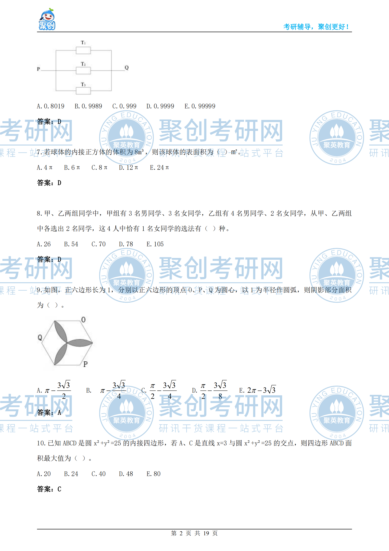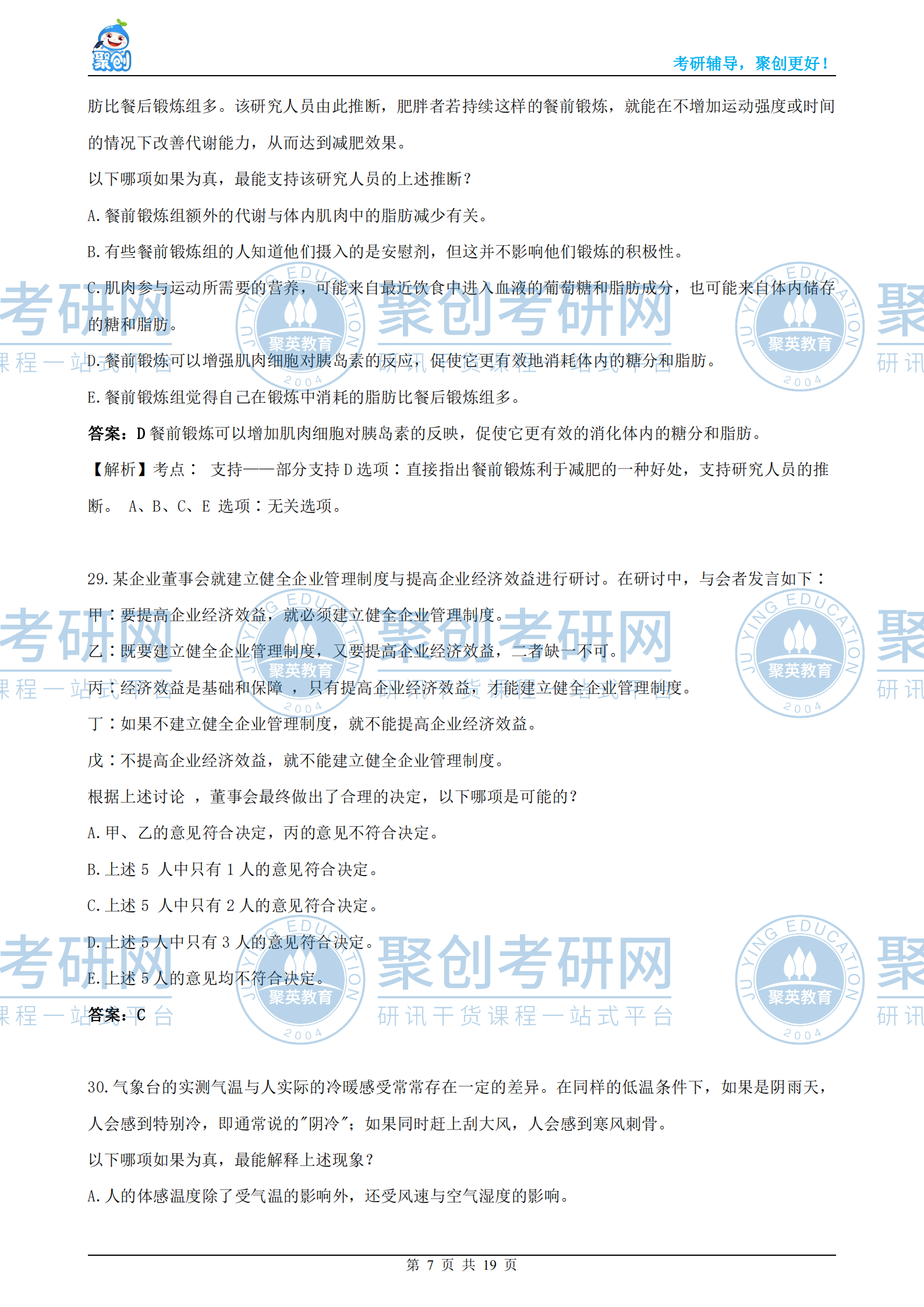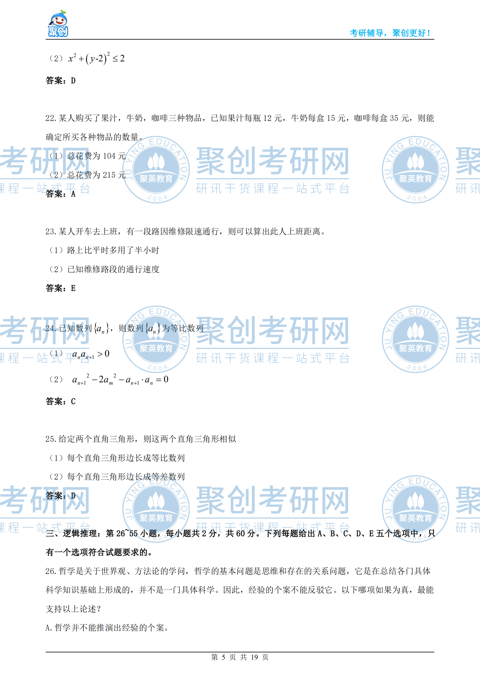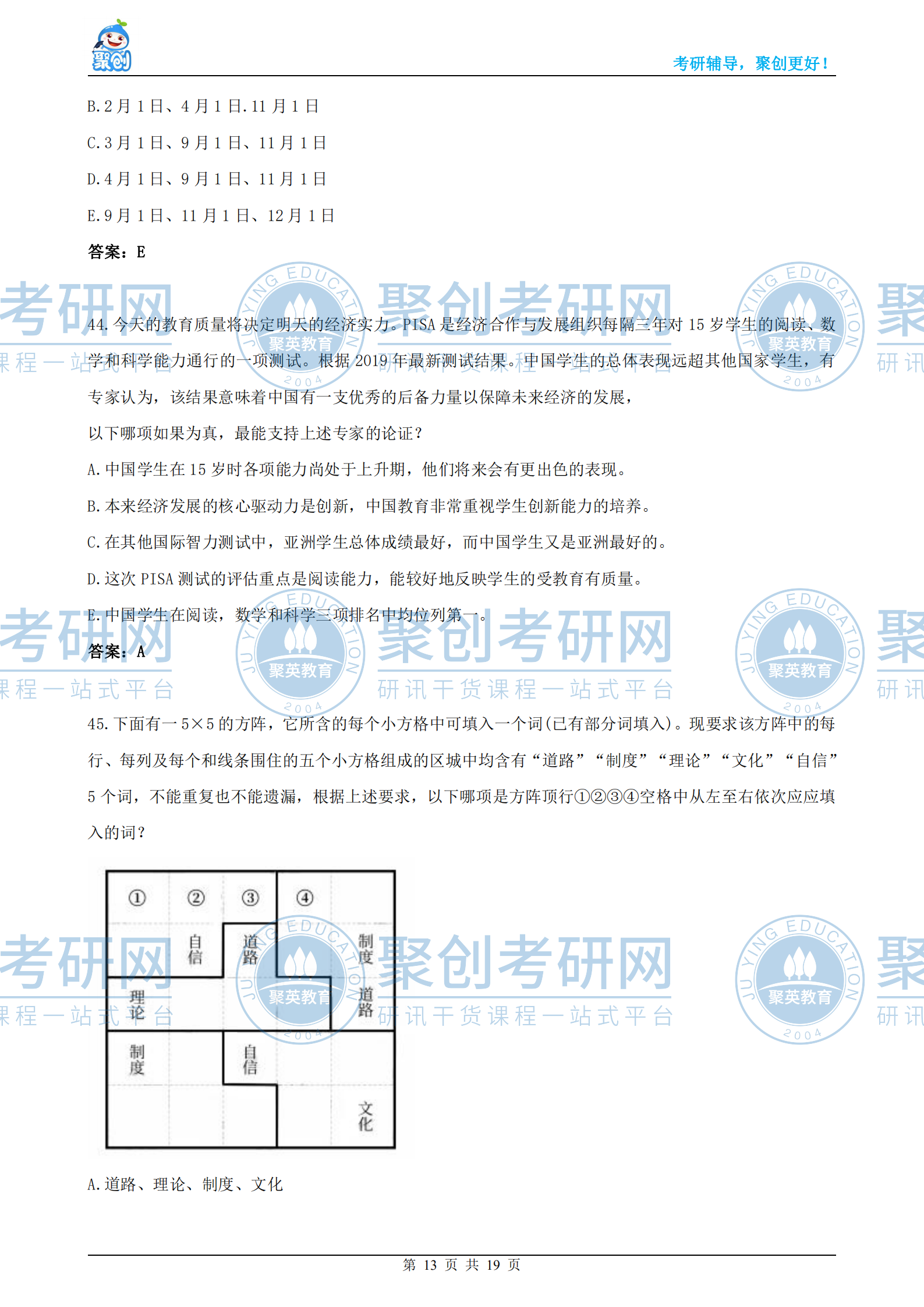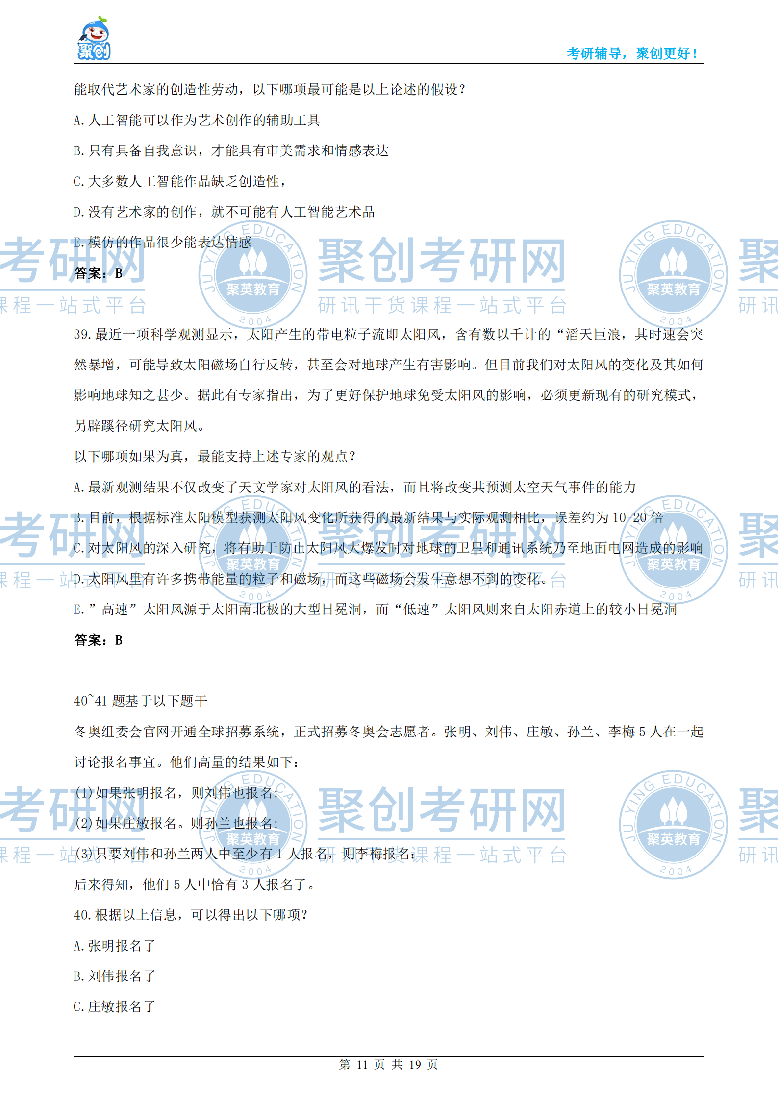 以上是聚创考研网为考生整理的"【对答案】2021年考研199管理类联考综合试题+答案解析"的相关考研信息,希望对大家考研备考有所帮助! 备考过程中如有疑问,也可以添加老师微信juchuang911进行咨询。