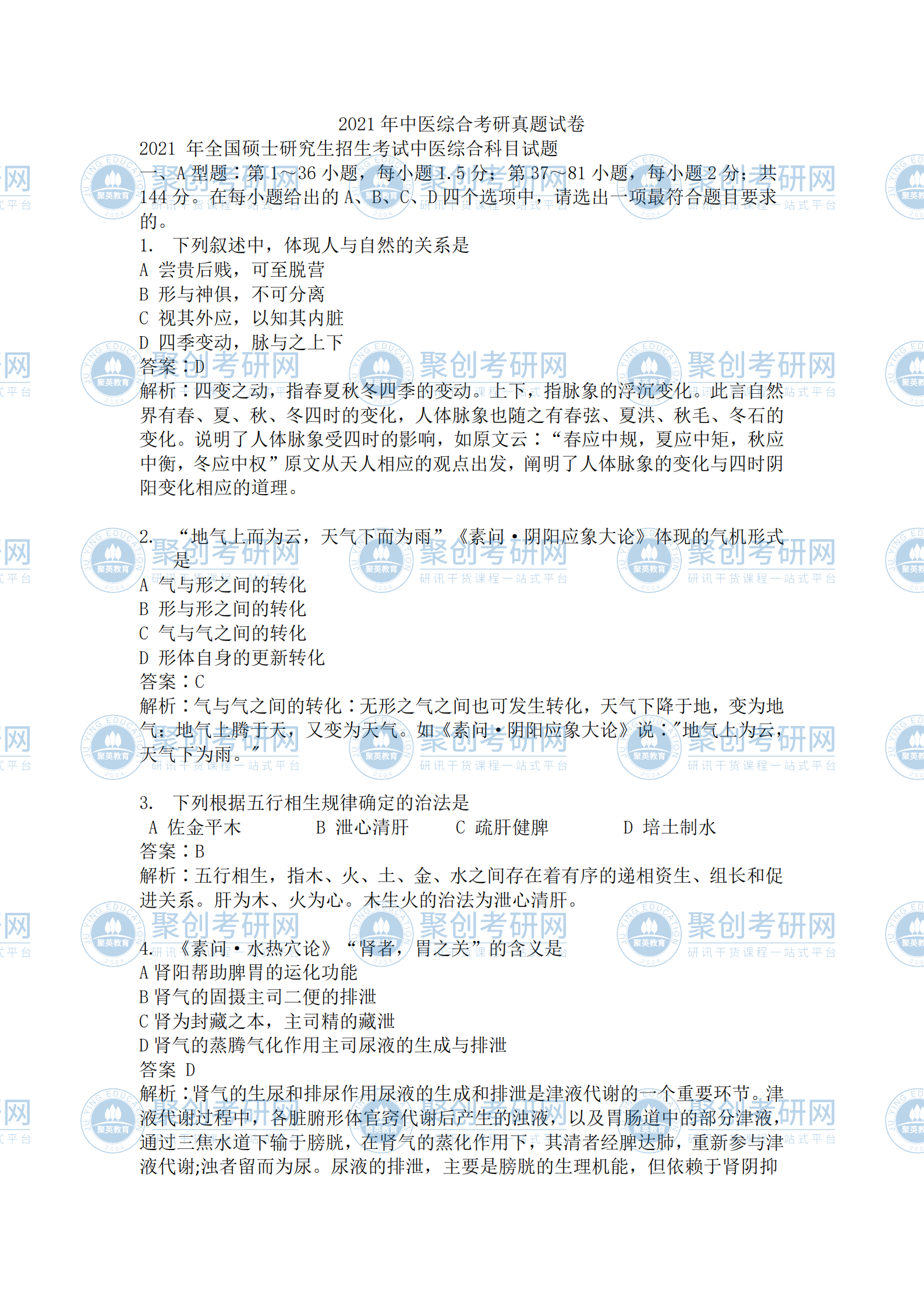 以下是聚创考研信息网小编整理的2021年考研307中医综合真题与答案+解析,帮助刚刚考研完的童靴们做好考后估分,同时也可以下载真题作为考研复习资料使用哦!