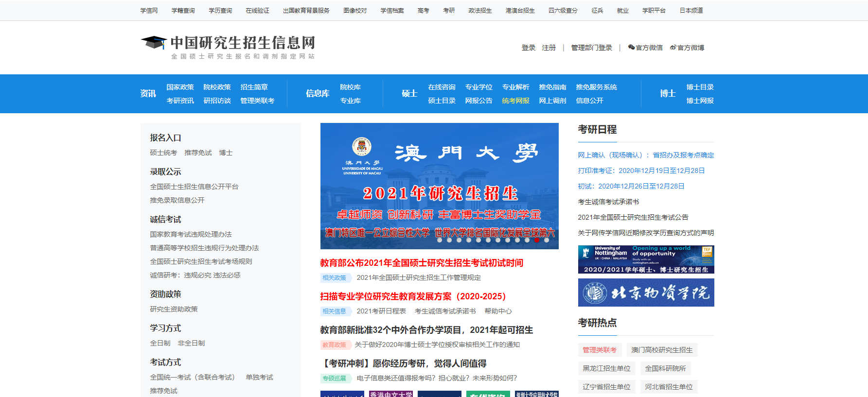 研招网是以考研为主题的官方网站,在这里面你可以找到院校库、专业库、专业目录、历年国家线趋势、调剂系统等。