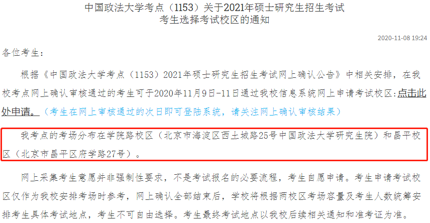 该考点的考场分布在学院路校区(北京市海淀区西土城路25号中国政法大学研究生院)和昌平校区(北京市昌平区府学路27号)。