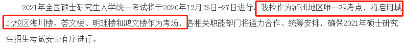 我校作为泸州地区唯一报考点,将启用城北校区海川楼、荟文楼、明理楼和鸿文楼作为考场,各相关职能部门将通力合作、统筹安排,确保2021年硕士研究生招生考试安全有序进行。