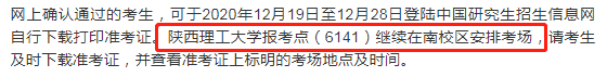 陕西理工大学报考点(6141)继续在南校区安排考场,请考生及时下载准考证,并查看准考证上标明的考场地点及时间。
