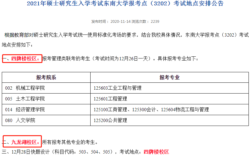 考试地点安排如下:四牌楼校区:报考管理类联考的考生(考试时间为12月26日一天);九龙湖校区:所有报考其他专业的考生;12月28日快题设计,考试地点:四牌楼校区。