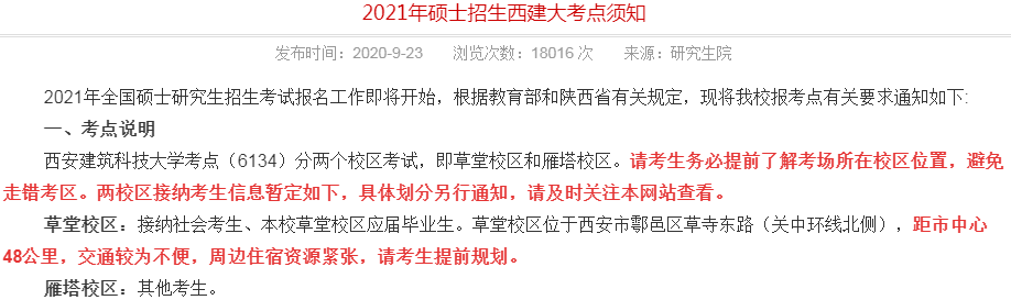 西安建筑科技大学考点分两个校区考试,即草堂校区和雁塔校区。请考生务必提前了解考场所在校区位置,避免走错考区。