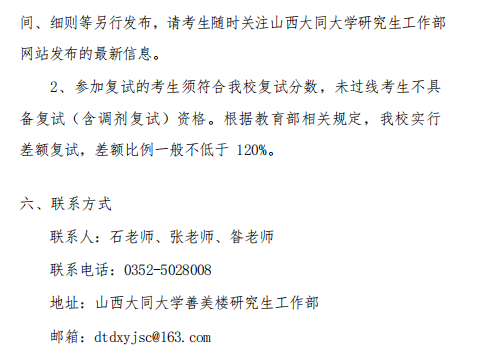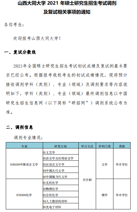 山西大同大学2021年研究生招生考试调剂及复试相关事项的通知
