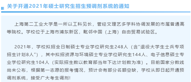 2021考研初试成绩出来后,很多分数擦线的学生需要调剂。快速掌握调剂院校专业、调剂名额、调剂要求等信息至关重要。聚创考研收集【上海市】2021年考研各院校调剂信息汇总,调剂信息较多,请大家持续关注!