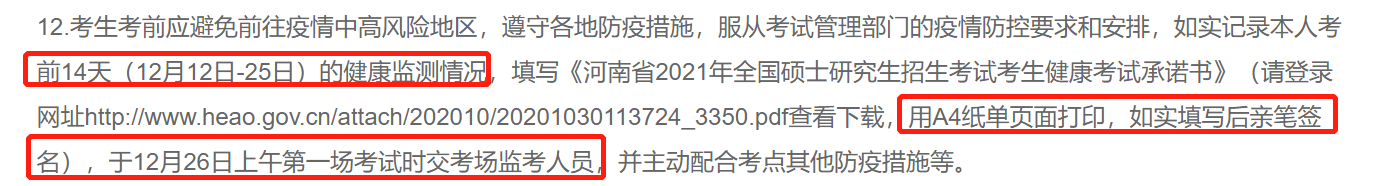 ① 河南:考生需如实记录考前14天(12月12日~25日)健康监测情况,签订《健康考试承诺书》用A4纸打印,于12月26日上午第一场考试时交考场健康人员。