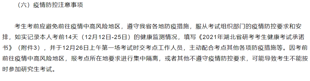 ③ 湖北:考生考前应避免前往疫情中高风险地区,如实记录本人考前14天(12月12日-25日)的健康监测情况,填写《2021年湖北省研考考生健康考试承诺书》,并于12月26日上午第一场考试时交考点工作人员,主动配合考点其他各项防疫措施等。