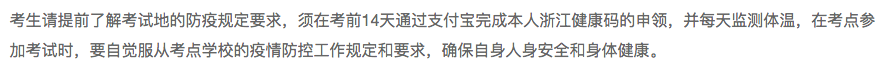 ④ 浙江:考生请提前了解考试地的防疫规定要求,须在考前14天通过支付宝完成本人浙江健康码的申领,并每天监测体温,在考点参加考试时,要自觉服从考点学校的疫情防控工作规定和要求,确保自身人身安全和身体健康。
