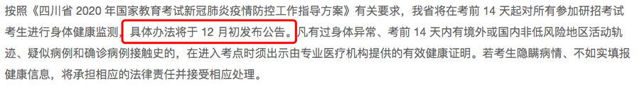 ⑤ 四川:四川省将在考前14天起对所有参加研招考试考生进行身体健康监测,具体办法将于12月初发布公告。凡有过身体异常、考前14天内有境外或国内非低风险地区活动轨迹、疑似病例和确诊病例接触史的,在进入考点时须出示由专业医疗机构提供的有效健康证明。