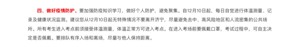 ⑦ 山东济宁:建议从12月10日起无特殊情况不要离开济宁,尽量避免去中、高风险地区和人流密集的公共场所。所有考生进入考点前须接受体温测量,体温正常方可进入考点。在进入考场前要佩戴口罩,考试过程中,可自主决定是否佩戴。