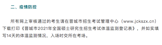 ⑧ 山西晋城:所有网上审核通过的考生,需在晋城市招生考试管理中心下载打印《晋城市2021年全国硕士研究生招生考试体温监测登记表》,并如实填写14天的体温监测情况,入场时交所在考场。