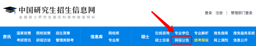 ① 登录「研招网」查看网报公告选择考点所在省市招办或报考点,查看相关公告。