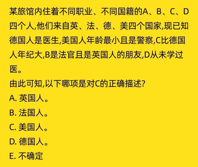 以上是聚创考研网为考生整理的"2021年管理类考研:逻辑部分-根据已知情况判断C是哪国人Part.200"的相关考研信息,希望对大家考研备考有所帮助! 备考过程中如有疑问,也可以添加老师微信juchuang911进行咨询。