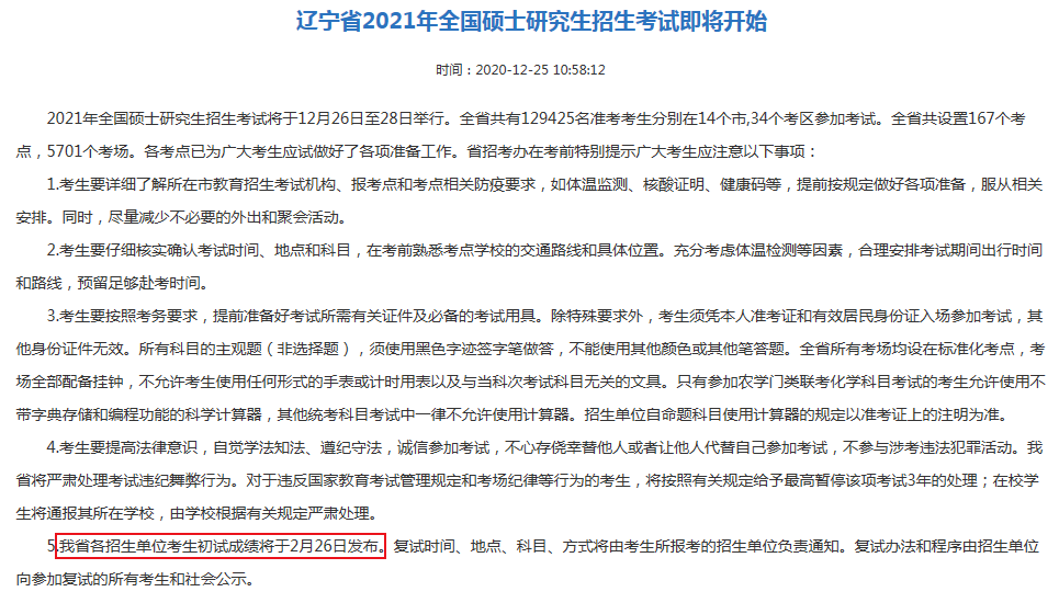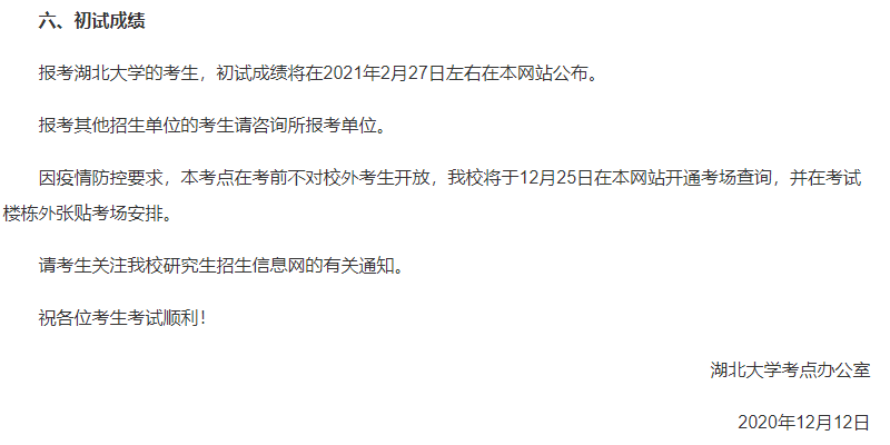 2021年春节是2月12日,在此之前,会有个别院校公布自命题专业课成绩,但是总的分数要到年后才会公布了。根据四川、辽宁省、天津、湖北、黑龙江、宁夏等教育考试院的信息,初试成绩将于2021年2月26日起陆续公布。(去年20考研因为突如其来的疫情而向后推迟了,今年我们已经有了充分的准备,有了应对的经验,包括线上复试,相信应该会如期公布成绩,举行复试。)