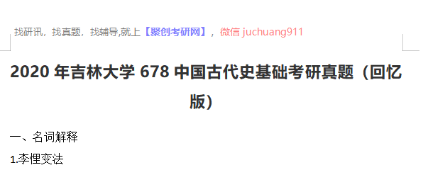 以上是聚创考研网为考生整理的"2020年吉林大学678中国古代史基础考研真题(回忆版)"的相关考研信息,希望对大家考研备考有所帮助! 备考过程中如有疑问,也可以添加老师微信juchuang911进行咨询。