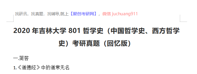 以上是聚创考研网为考生整理的"2020年吉林大学801哲学史(中国哲学史、西方哲学史)考研真题(回忆版)"的相关考研信息,希望对大家考研备考有所帮助! 备考过程中如有疑问,也可以添加老师微信juchuang911进行咨询。