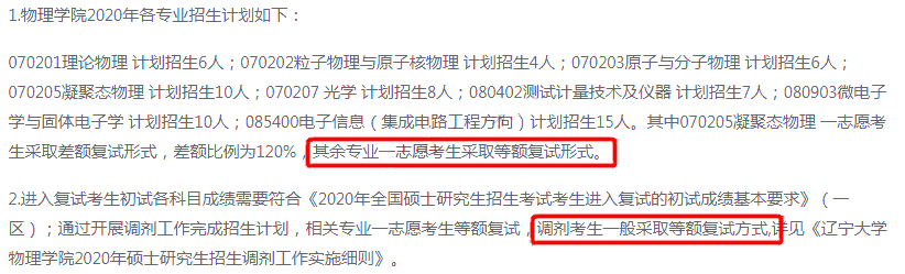 (1)辽宁大学物理学院去年在复试基本要求中提到,除070205凝聚态物理一志愿考生采取差额复试形式之外,其余专业一志愿考生采取等额复试形式,调剂考生一般也是采取等额复试方式。
