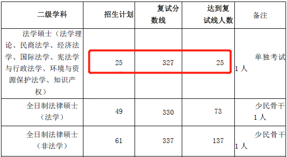 西北大学法学院全日制法学硕士专业,去年拟招生25人,进入复试25人,一志愿复试结果显示25人全部拟录取。