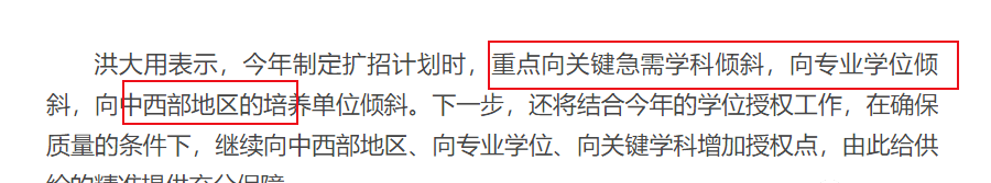 扩招计划重点向关键急需学科倾斜,向专业学位倾斜,向中西部地区的培养单位倾斜。